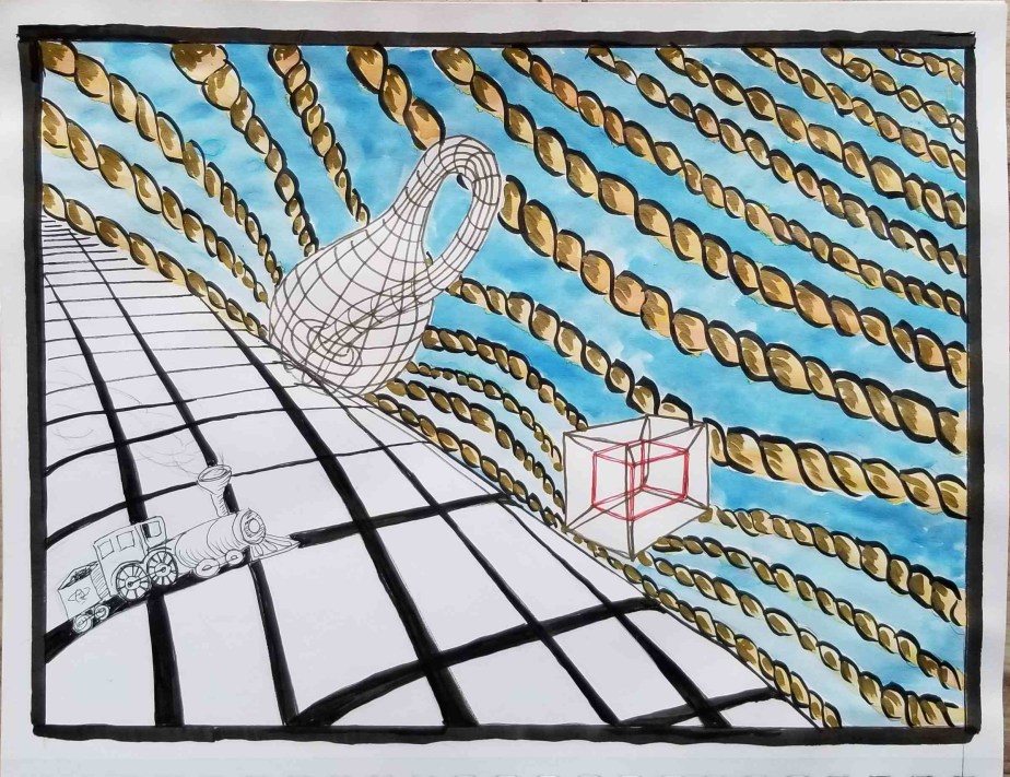 I was curious about the Klien Bottle and tesseract (4D objects) mentioned and got pretty good at drawing them. The train is from the quote “The train that can be expressed is not the express train” I’ll be taking my time reading through the book and creating visual memories of my journey.