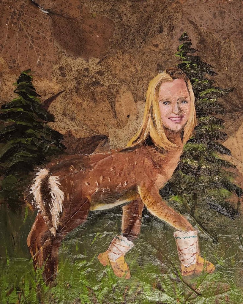 Early in the spring of 2021 we went for a hike in the forest with a young friend who recently moved to Manitoulin. Such a delightful spirit she has, ready to leap and dash through the woods in her moccasins but she wore boots as it was a little wet. She sent me a photo of moccasins that she had made. The terrain here is quite rocky and Amber, being in her prime of life, was so agile in her movement along the trail that i imagined that she was a deer. Later I covered a board with leaves and drew a picture of Amber as a deer and set the scene aside. In July i picked up the sketch and finished it.