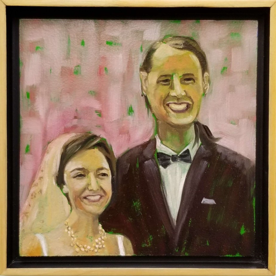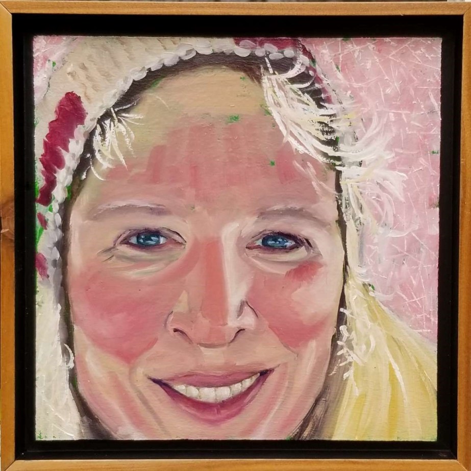 This is a painting of a friend in our rural neighbourhood. Emily was the first to stop by to check on us and drop off food when C-19 hit and we have had many visits since. It is in her blood to be helpful, cheerful and sincere. The setting of this painting is in the winter when her hair was covered in icy crystals after skiing.