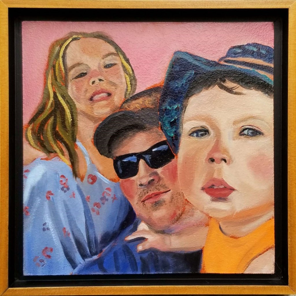 Three faces in a small square. The July series was done on 8 x 8 inch Masonite squares so the faces of this loving family are quite small. I know this family well and the love they have for their grandkids is boundless. When I look at the painting I see the constant effort and vigilance this Poppa and Nana (not in the painting) practice in guiding these young ones. It is a remarkable illusion to have so much meaning in miniature.