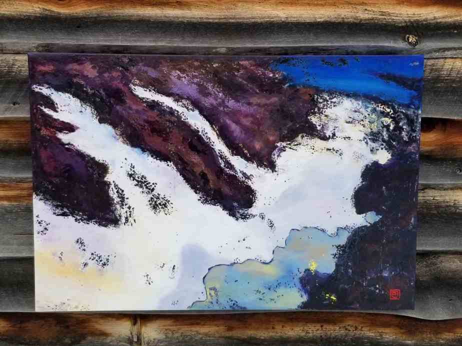 Chutes park is small in size yet has a mighty spectacle on the Twin Bridges Trail – 6 km return (2 hours) moderate. Following the Aux Sables River this hiking trail leads to lookouts at the falls and the Seven Sisters Cataracts where i took many photos of this powerful wonder. This painting is from one of those shots.